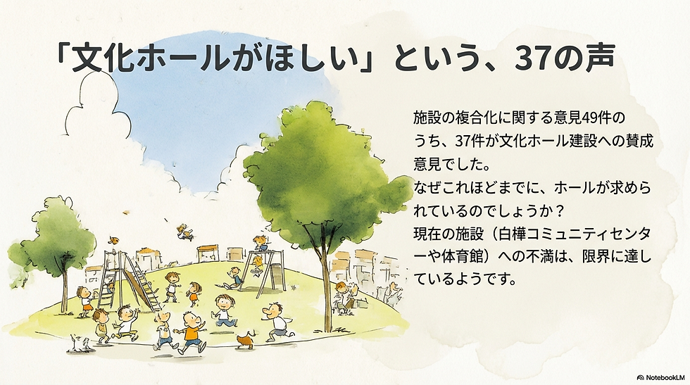 複合化についての意見49件中、37件が文化ホール建設を求める賛成意見でした。現在の施設(白樺コミュニティセンターや総合体育館)の利用には多くの町民が不満を感じているようです。